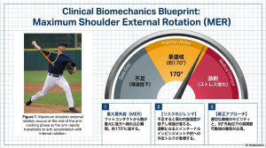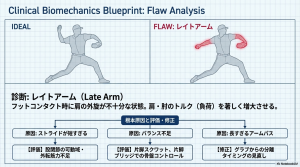 理想的なMERは約170°です。この角度は球速と正の相関がありますが、過度な外旋は肩のインピンジメントや肘の varus torque(内反トルク)を増大させます。 - 「肘が先行する(Leading with the elbow)」の診断