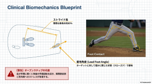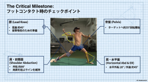 投球の精度と安全性を決定づけるのは、リード側の足が接地した瞬間(フットコンタクト)の身体配置です。