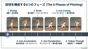 投球動作は、下半身で生成したエネルギーを末端のボールへと増幅させながら伝える「キネマティック・チェーン(運動連鎖)」のプロセスです。バイオメカニクスでは、この一連の動きを以下の6つのフェーズに定義します。