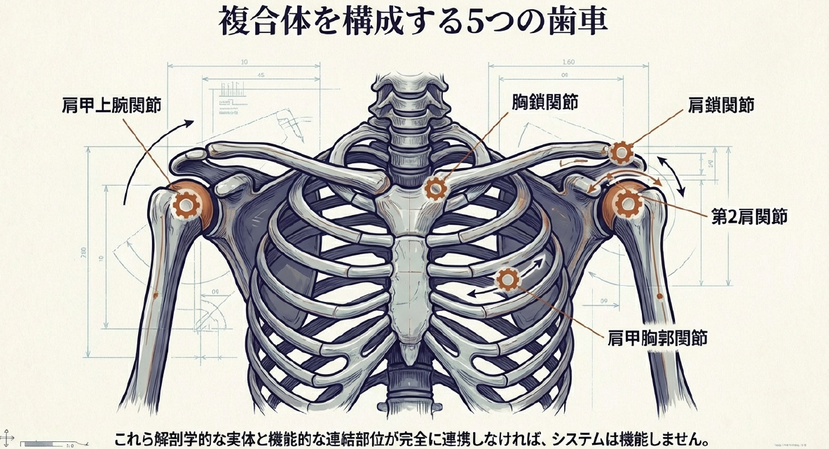 私たちが何気なく腕を上げ、ボールを投げ、あるいはゴルフクラブを振るその瞬間、肩の中では驚くほど緻密で複雑なオーケストラが奏でられています。多くの人は「肩の関節」と聞くと、腕の付け根にある一つの関節だけを思い浮かべるかもしれませんが、専門的な視点に立てば、それは「肩関節複合体(shoulder complex)」という、五つの関節が完璧な連携を求められる運命共同体なのです。この複合体は、解剖学的な実体を持つ肩甲上腕関節、胸鎖関節、肩鎖関節の三つに加え、機能的な連結部位である肩甲胸郭関節と、いわゆる「第2肩関節」と呼ばれる肩峰下滑動機構によって構成されています。これら五つの歯車が、一分の狂いもなく噛み合うことで初めて、人体最大の可動域と繊細な運動制御の両立が可能になるのです。