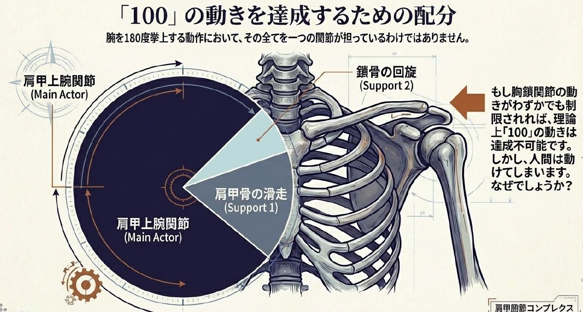 興味深いのは、肩の動きを「100」という数値で捉えたとき、そのすべてを一つの関節が担っているわけではないという点です。例えば、腕を真上に挙げる動作一つをとっても、メインとなる肩甲上腕関節が主役を務めつつ、土台となる肩甲骨が胸郭の上を滑り、さらに鎖骨がダイナミックに回旋することで、ようやく180度の可動域が達成されます。もし、このうちのどこか、例えば鎖骨の動きを支える胸鎖関節の動きがわずかでも制限されれば、理論上は「100」の動きは達成できません。しかし、人間の身体は非常に巧妙で、不足した分を他の関節が過剰に動いて埋め合わせようとします。これが「代償動作」の正体です。見かけ上は腕が挙がっているように見えても、その裏側では特定の組織が悲鳴を上げているケースが少なくありません。