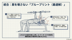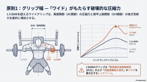 長期的なトレーニングの持続可能性を考慮するならば、手幅をBAWの1.5倍未満に設定することが、肩の健康を守るための第一の防衛線となります。