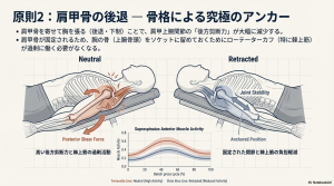 多くのコーチが指導する「肩甲骨の内転(リトラクション)」は、単なるフォームのコツに留まりません。バイオメカニクスの観点から見れば、これは肩甲上腕関節(GH関節)を安定させ、回旋筋腱板(ローテーターカフ)への負荷を劇的に軽減する最強の防御策です。