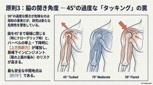 「肩を痛めたら脇を閉じて行え」という一般的なアドバイスには注意が必要です。肩の挙上角度(アブダクション角度)を小さくしすぎること、特に45度付近まで脇を閉じるフォームは、必ずしも安全とは言えません。