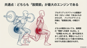 データが示した最も顕著な事実は、BSQとBGSQのどちらもが圧倒的に股関節主導(Hip Dominant)な種目であるということです。