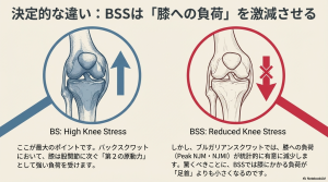 つまり、BGSQで膝への負担が減るのは、単に「浅いから」ではなく、片脚動作特有のレバーアームの変化や、足首・股関節への負荷分散といった構造的なメカニクスの変化が主因であると考えられます。