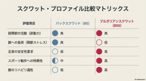 バックスクワットとブルガリアンスクワットの比較において、重要なのは優劣ではなく「目的に対する適合性」です。