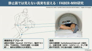 従来の仰臥位でのMRI検査には限界があります。安静時には十分なスペースがあるように見えても、特定の動作で痛みが誘発される狭小を捉えきれないためです。そこで参考となるのが、臨床テストを再現した肢位で撮影する「FABER MRI」の知見です。