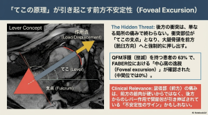 FABER肢位で股関節後方(坐骨 vs 転子間稜)に衝突が起こると、そこが 支点(fulcrum) となり、大腿骨頭を前方へと押し出すテコの原理が働きます。これを「foveal excursion(大腿骨頭窩の逸脱)」と呼び、QFME群の 63% という高頻度で発生していました。