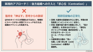 - 組織へのアプローチ: 大腿方形筋への介入は、単なる筋緊張の緩和ではなく、後方衝突による「支点形成」を防ぎ、前方の関節唇ストレスを軽減させるための空間確保を目的とする。