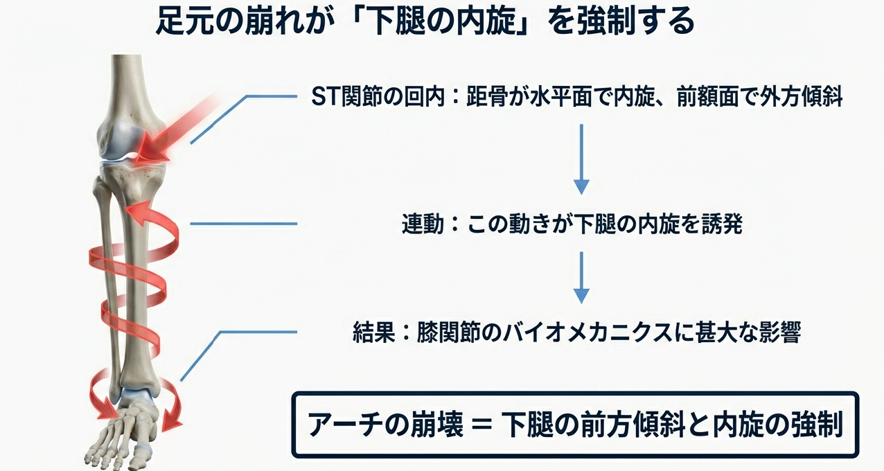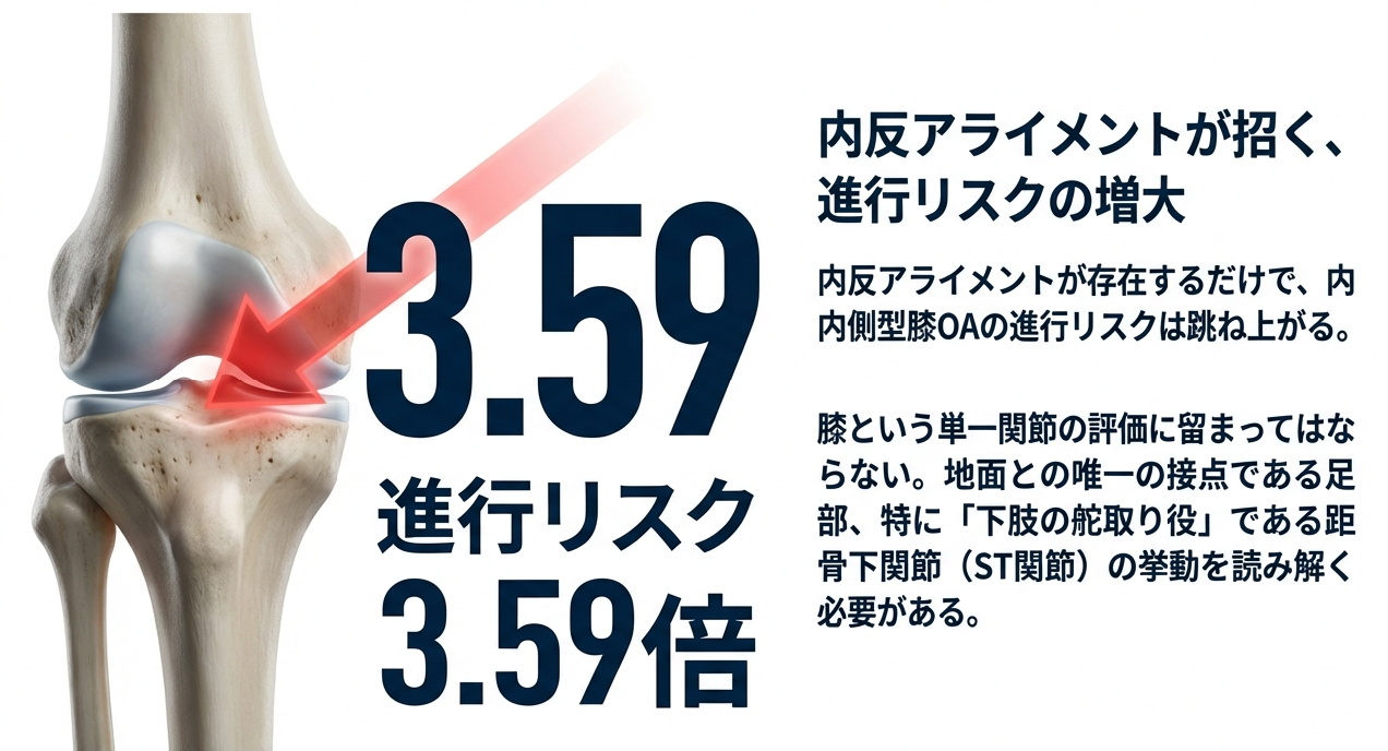 膝OAの多くは内側型であり、内反変形によって下肢の機械的軸が内側に偏ることで、内側コンパートメントへの負荷が加速度的に増大します。ある研究によれば、内反アライメントが存在するだけで内側型膝OAの進行リスクは実に3.59倍にも跳ね上がると報告されています。この深刻なリスクを制御するためには、膝という単一関節の評価に留まらず、地面との唯一の接点である足部、特に「下肢の舵取り役」を担うST関節の挙動を深く読み解く必要があります。