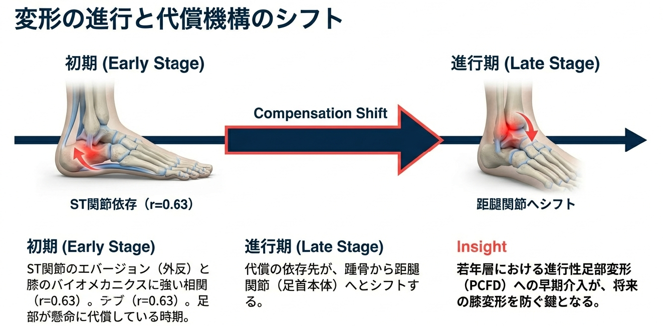 海外の研究に目を向けると、膝OAの進行度と足部の代償機構には密接な相関があることがわかってきます。ある報告では、内反膝OA患者においてST関節のエバージョン(外反・回内方向の動き)と膝のバイオメカニクスには強い相関(r=0.63)が認められましたが、病期が進行するにつれて、この代償作用は踵骨から距腿関節(足首の本体)へと依存先をシフトさせていくことが示唆されています。これは、身体が進行する変形に対して、より上位の関節を用いて必死に水平を保とうとする適応反応の結果かもしれません。また、若年層における進行性足部変形(PCFD)が、将来的な膝の内反変形と相関するという知見は、膝の痛みが発現する以前の、足部からの早期介入がいかに重要であるかを物語っています。