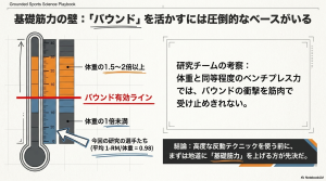 バウンドは、筋肉が引き伸ばされた直後に短縮する「伸張短縮サイクル(SSC)」を利用した動きであり、上半身における「ドロップジャンプ」のようなものです。しかし、この弾性エネルギーを爆発的な力に変換するためには、衝撃を吸収し、即座に跳ね返すための高い「遠心性筋力(エキセントリック筋力)」が必要です。