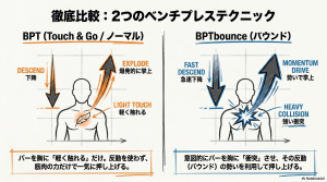 - バウンドあり群 (BPTbounce): バーベルを胸で弾ませて爆発的に挙上する。
