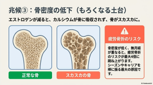 - 骨密度の低下 (BMD: Bone Mineral Densityの低下): 骨がスカスカになり、将来の骨粗鬆症や疲労骨折のリスクが高まる状態です。