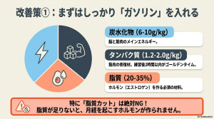 - 脂質: ホルモンバランスのために不可欠。総エネルギーの20%未満にならないよう注意しましょう。
