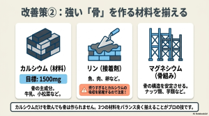 | カルシウム | 骨の強化 | 牛乳、チーズ、ケール、豆 | ビタミンD、乳糖 | 食物繊維、リン、シュウ酸 |
