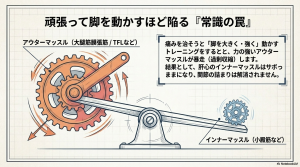 「動かせば動かすほど良い」わけではありません。大きく動かして「前ももや外もも」が疲れてきたら、それは代償動作(間違った動き)のサインです。