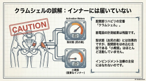 クラムエクササイズは「梨状筋」や「大殿筋」を選択的に収縮させるためには非常に有効ですが、股関節の安定(求心位の保持)に不可欠な「小殿筋」を働かせるには適していません。