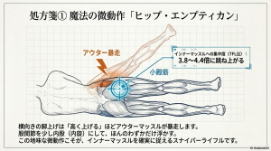 これらは関節包を包み込むように付着し、股関節を正しい位置(求心位)にピタッと安定させる役割を担っています。これらの筋肉が適切に働くことで、前述した疎生結合組織の滑りが改善され、骨同士のぶつかり(インピンジメント)を防ぐことができるのです。