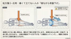 - コツ: 床に当たっている側の「大転子(太ももの外側にある出っ張った骨)」にかかる重みの感覚を意識してください。その感覚を頼りに骨盤を動かすことで、小殿筋を精度高く活性化できます。