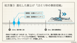 - 驚きの先行収縮: 筋電図の研究では、足を上げるわずか15ミリ秒(0.015秒)前に、「反対側の」腹横筋と小殿筋が先に活動を開始することがわかっています。 これは、足を上げる際の衝撃に備えて、脳が「反対側の骨盤と腰」をあらかじめガッチリ固定しようとする防御反応です。トレーニングの際は、足を上げる前からお腹に力を入れてし、反対側の骨盤で床を捉える意識を持つと、より効果が高まります。